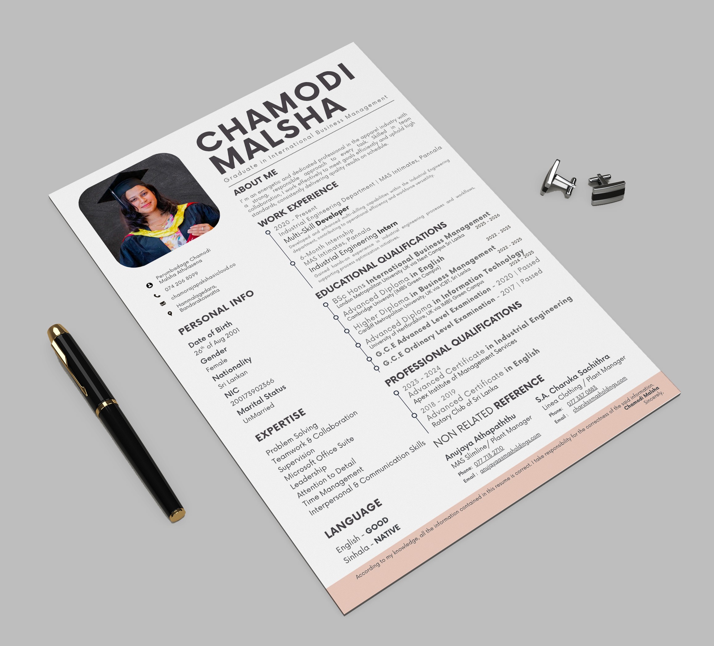 This project was created using Microsoft Word and Canva. I handled the entire design process, including layout structuring, typography selection, formatting, and final refinement, ensuring the resume meets both professional standards and visual quality expectations.