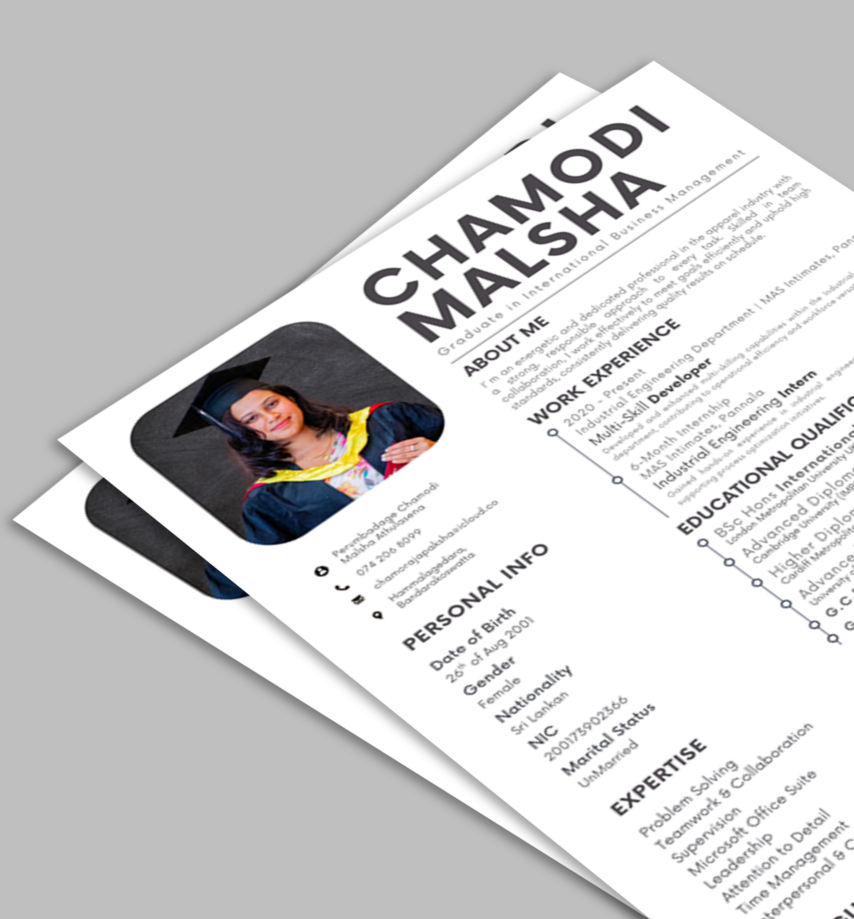 This project involved designing a professional resume for an undergraduate student, focusing on presenting academic qualifications, skills, and experience in a clear and visually appealing format. The layout was carefully structured to ensure all information is easy to read and well-organized, making it suitable for job and internship applications.
